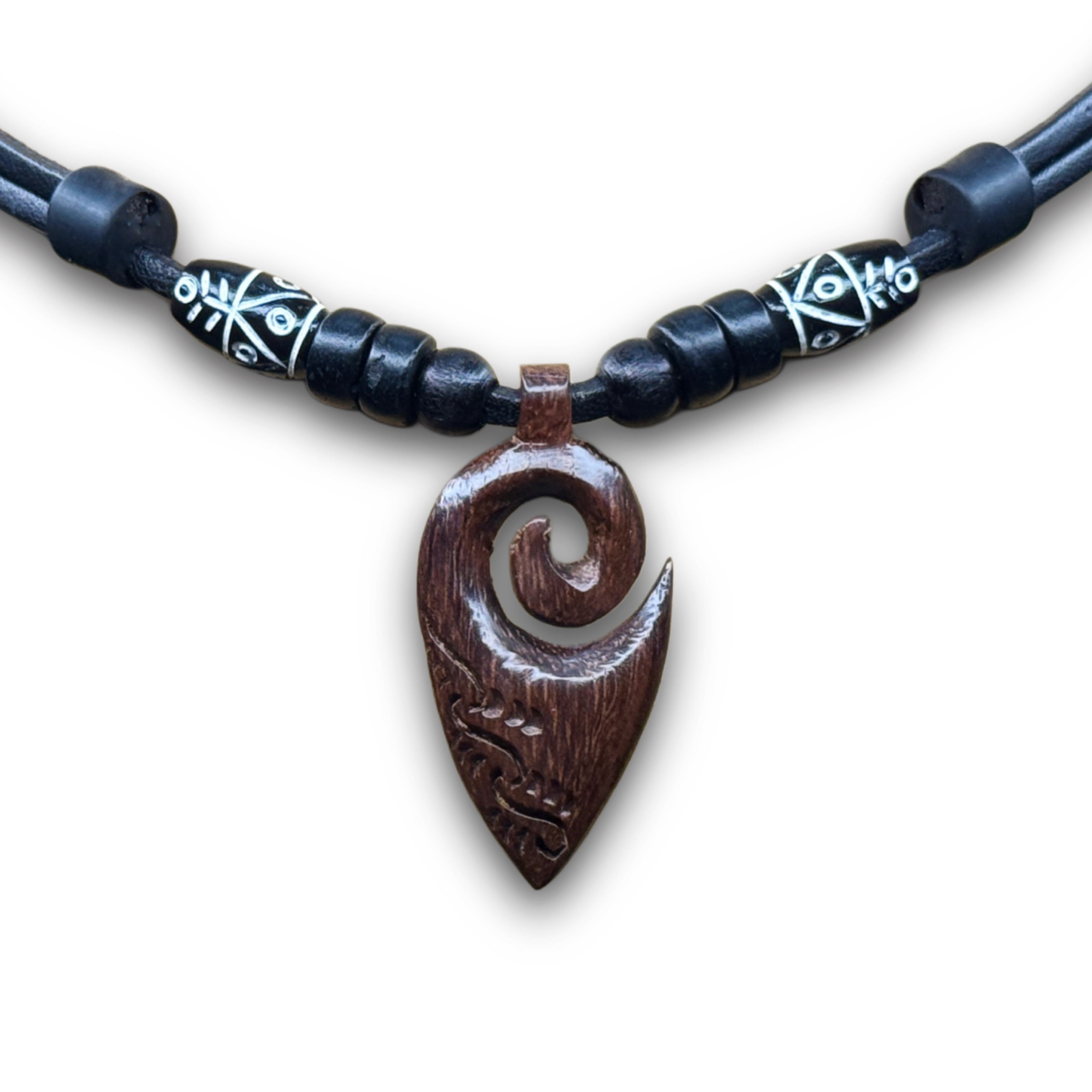 Schwarze Lederhalskette mit handgeschnitztem Koru Anhänger aus poliertem Palisander (Hartholz), kombiniert mit handgecarvten Tubes und Kokosnussperlen. Der Anhänger hat eine Größe von ca. 3,5 cm.