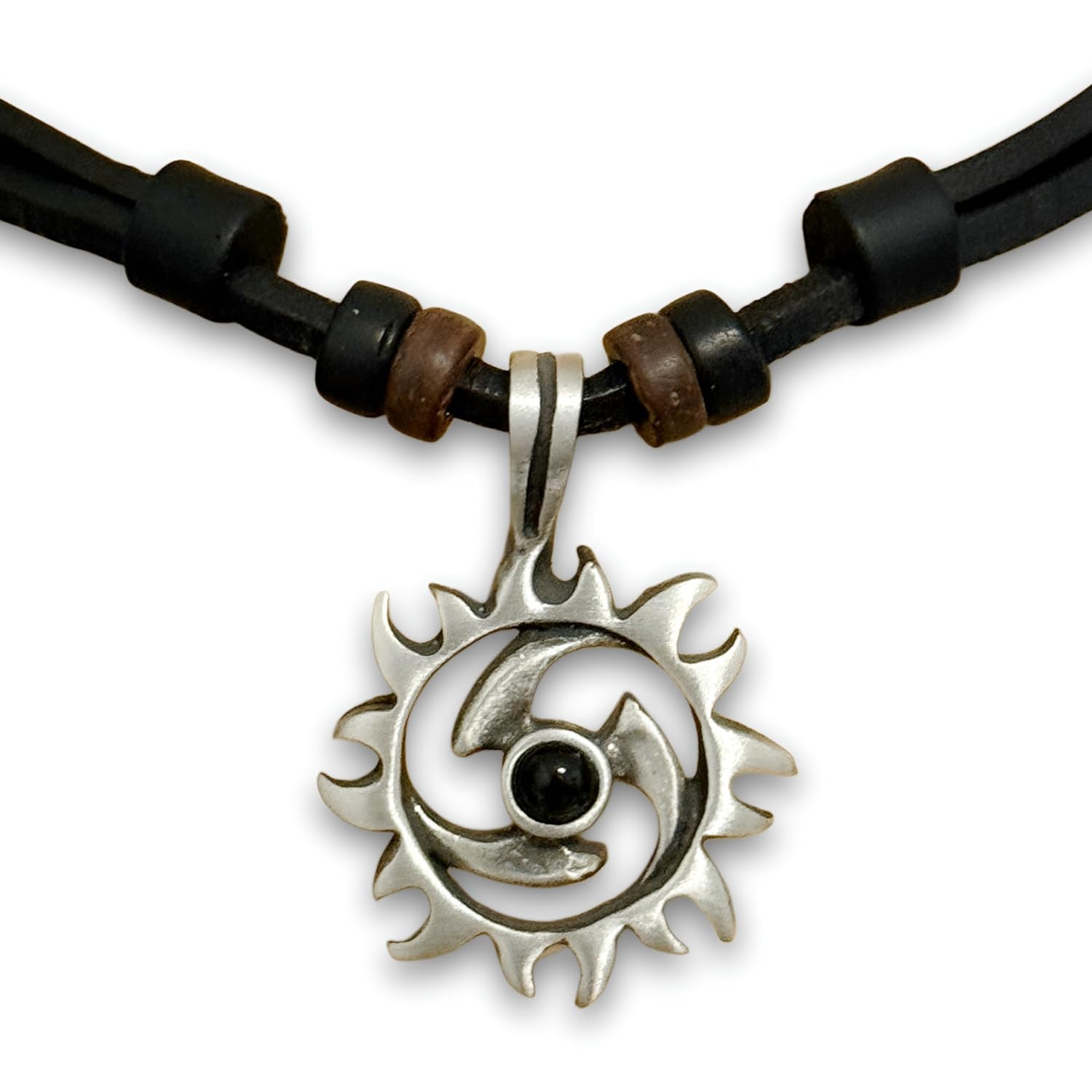 Schwarze Lederkette mit Anhänger in Form einer Sonne (Größe ca. 3 cm), verziert mit schwarzem Schmuckstein, gefertigt aus feinstem, schadstofffreien Pewter / Einzigartiger Schmuck für Individualisten, der auch perfekt als Geschenk für jeden Anlass geeignet ist.