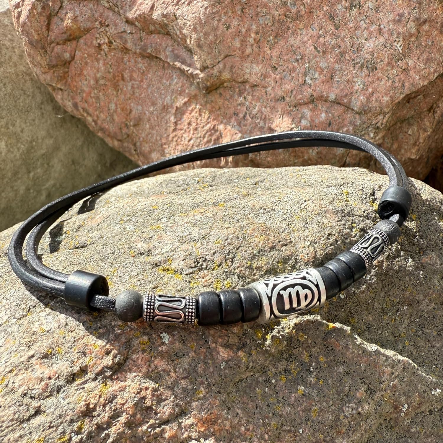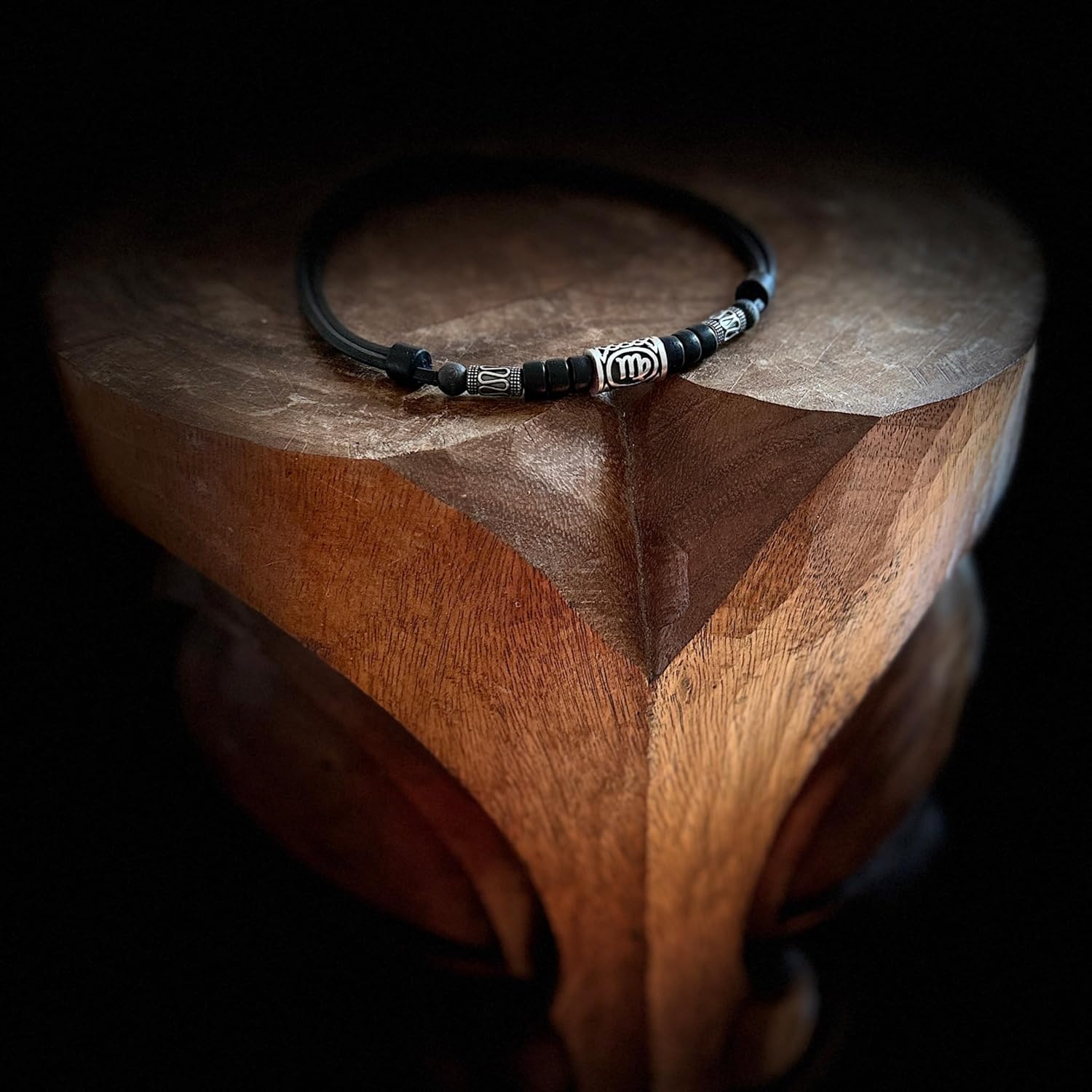 Wir verwenden ausschließlich extra stabiles Kernleder vom Rind, welches besonders stabil und reißfest ist. Die Kette lässt sich mittels zweier Holzperlen (links und rechts im Bild) variabel verstellen und passt somit für jede Halsweite. Der Verstellbereich liegt etwa zwischen 35 und 65 cm, die gewünschte Länge lässt sich innerhalb von Sekunden problemlos einstellen.
