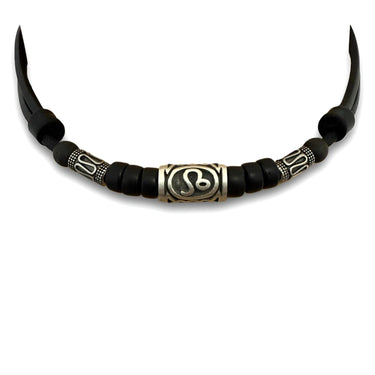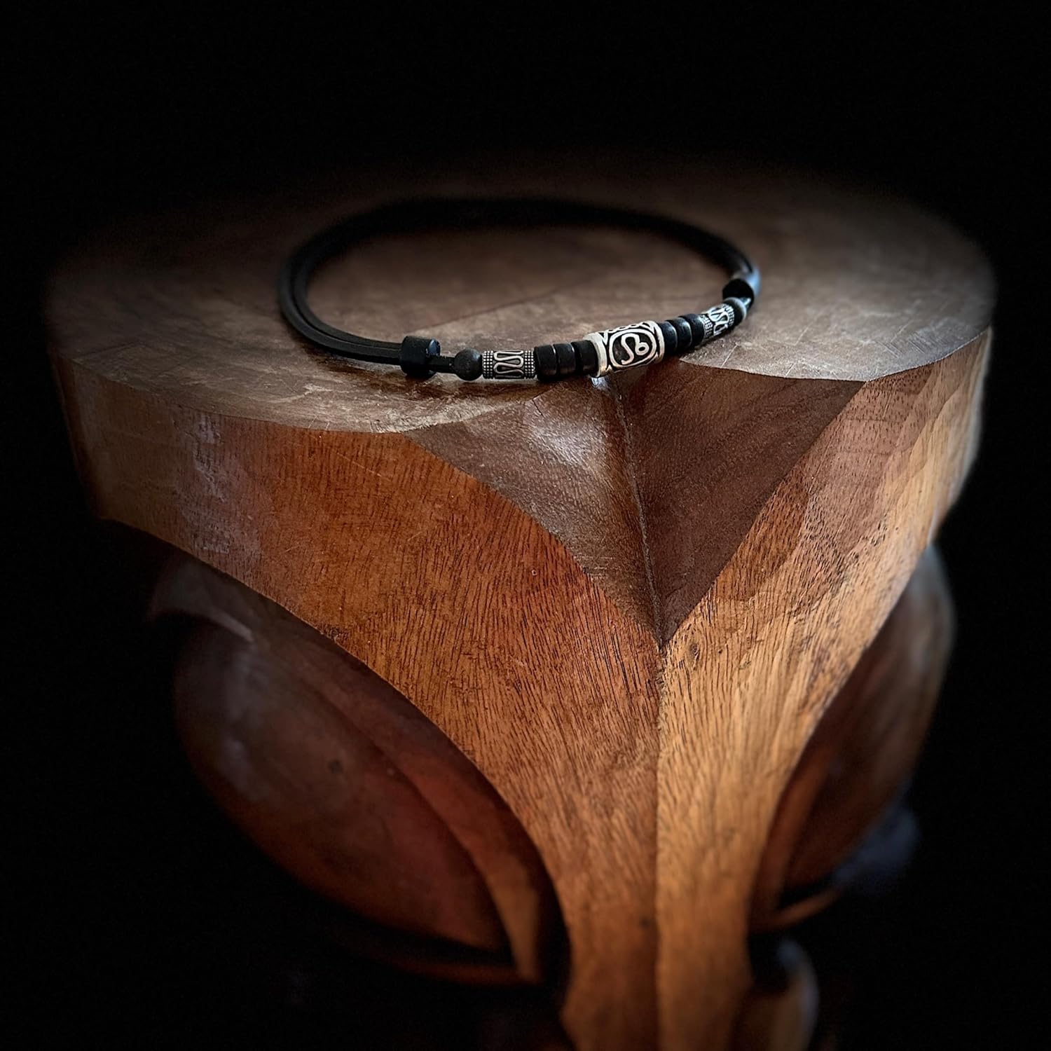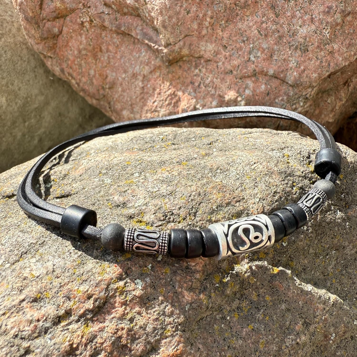 Wir verwenden ausschließlich extra stabiles Kernleder vom Rind, welches besonders stabil und reißfest ist. Die Kette lässt sich mittels zweier Holzperlen (links und rechts im Bild) variabel verstellen und passt somit für jede Halsweite. Der Verstellbereich liegt etwa zwischen 35 und 65 cm, die gewünschte Länge lässt sich innerhalb von Sekunden problemlos einstellen.