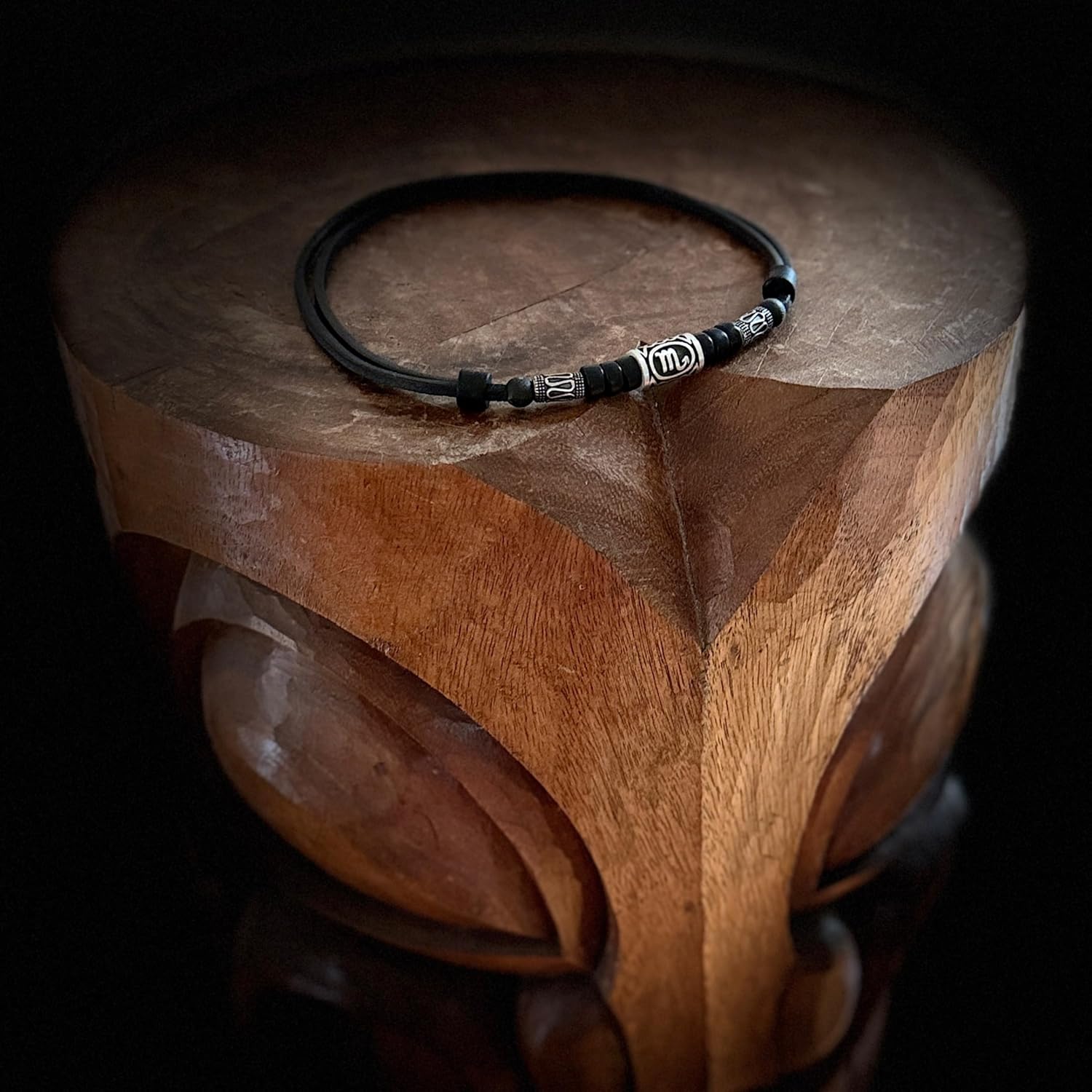 Wir verwenden ausschließlich extra stabiles Kernleder vom Rind, welches besonders stabil und reißfest ist. Die Kette lässt sich mittels zweier Holzperlen (links und rechts im Bild) variabel verstellen und passt somit für jede Halsweite. Der Verstellbereich liegt etwa zwischen 35 und 65 cm, die gewünschte Länge lässt sich innerhalb von Sekunden problemlos einstellen.