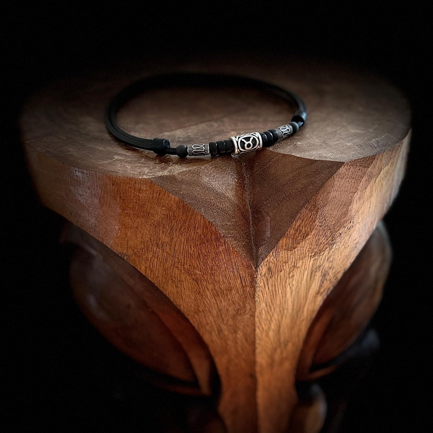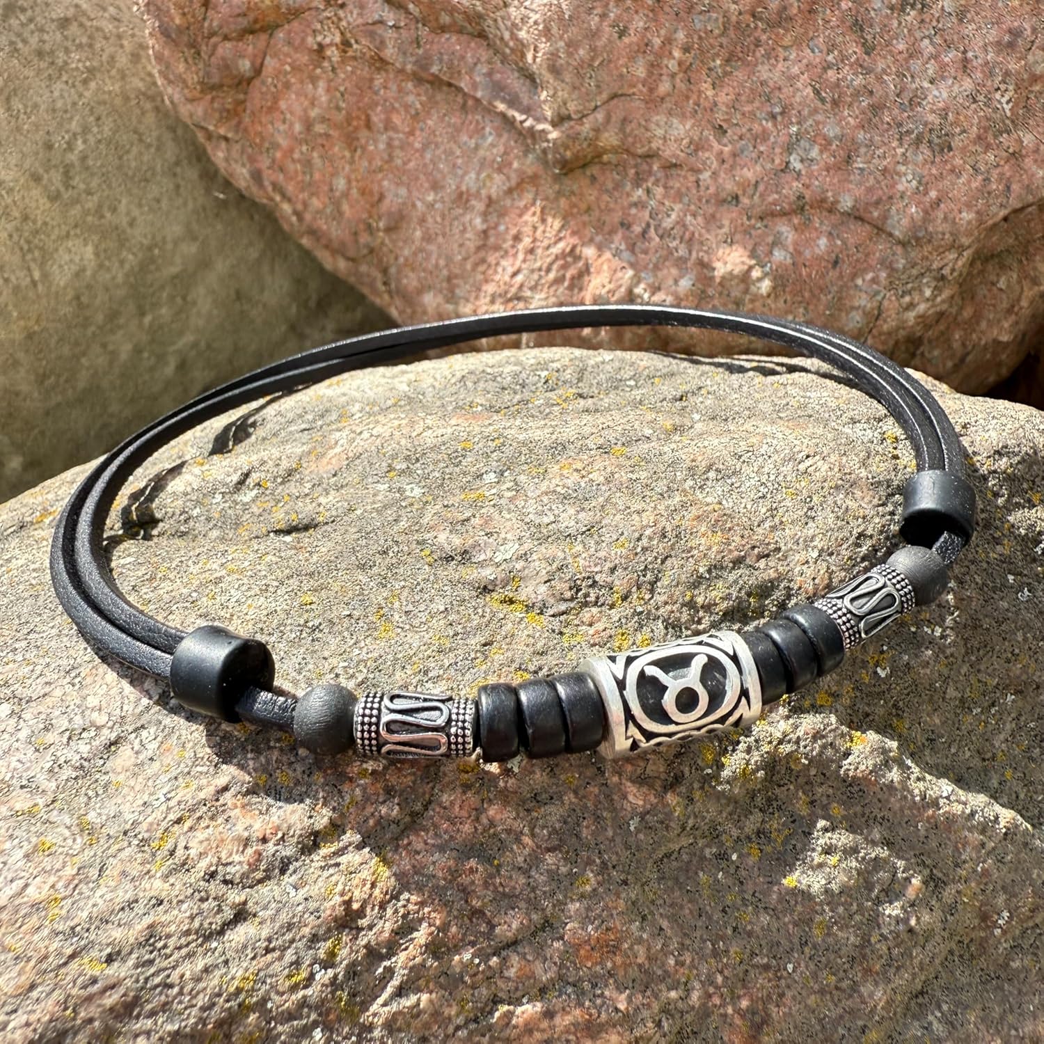 Halskette mit Sternzeichenperle "Stier" aus blei- & nickelfreiem Pewter, kombiniert mit Edelstahl Perlen und Kokosnuss.