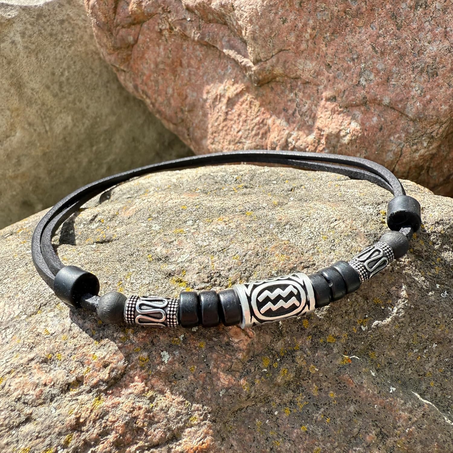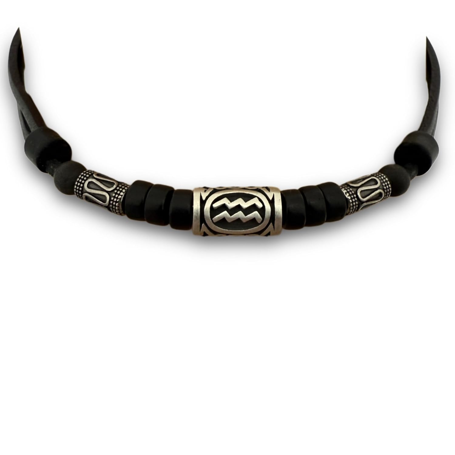 Halskette mit Sternzeichenperle "Wassermann" aus blei- & nickelfreiem Pewter, kombiniert mit Edelstahl Perlen und Kokosnuss.