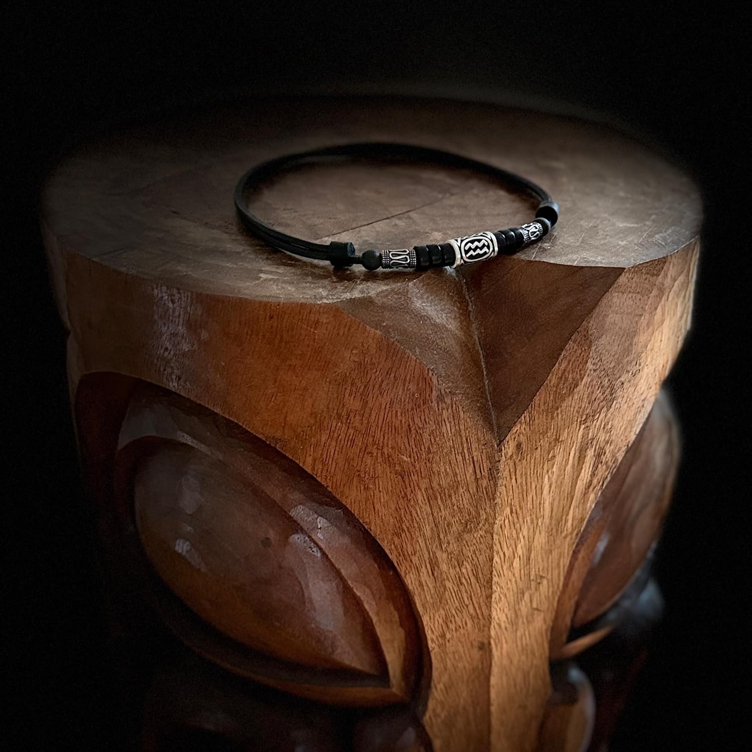 Wir verwenden ausschließlich extra stabiles Kernleder vom Rind, welches besonders stabil und reißfest ist. Die Kette lässt sich mittels zweier Holzperlen (links und rechts im Bild) variabel verstellen und passt somit für jede Halsweite. Der Verstellbereich liegt etwa zwischen 35 und 65 cm, die gewünschte Länge lässt sich innerhalb von Sekunden problemlos einstellen.