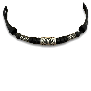 Halskette mit Sternzeichenperle "Widder" aus blei- & nickelfreiem Pewter, kombiniert mit Edelstahl Perlen und Kokosnuss.