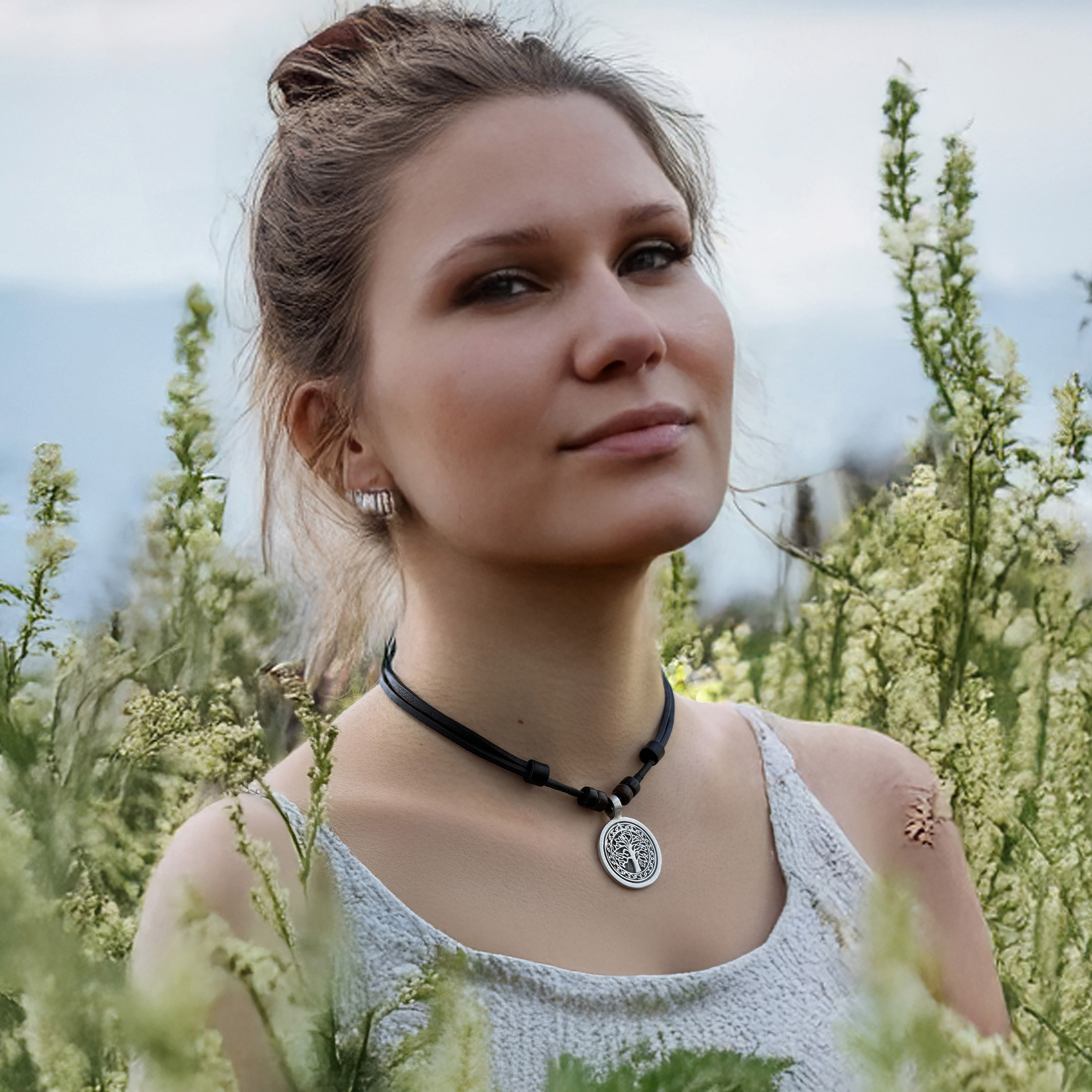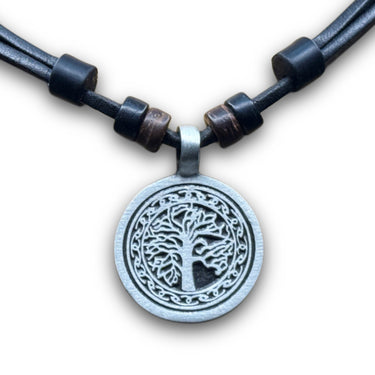 Sehr schön gearbeiteter "Tree of Life" (Lebensbaum) Anhänger, gefertigt aus hochwertigem Pewter. Der Anhänger hat eine Größe von ca. 3 cm, er wird an einer schwarzen Lederkette mit Kokosnussperlen geliefert.