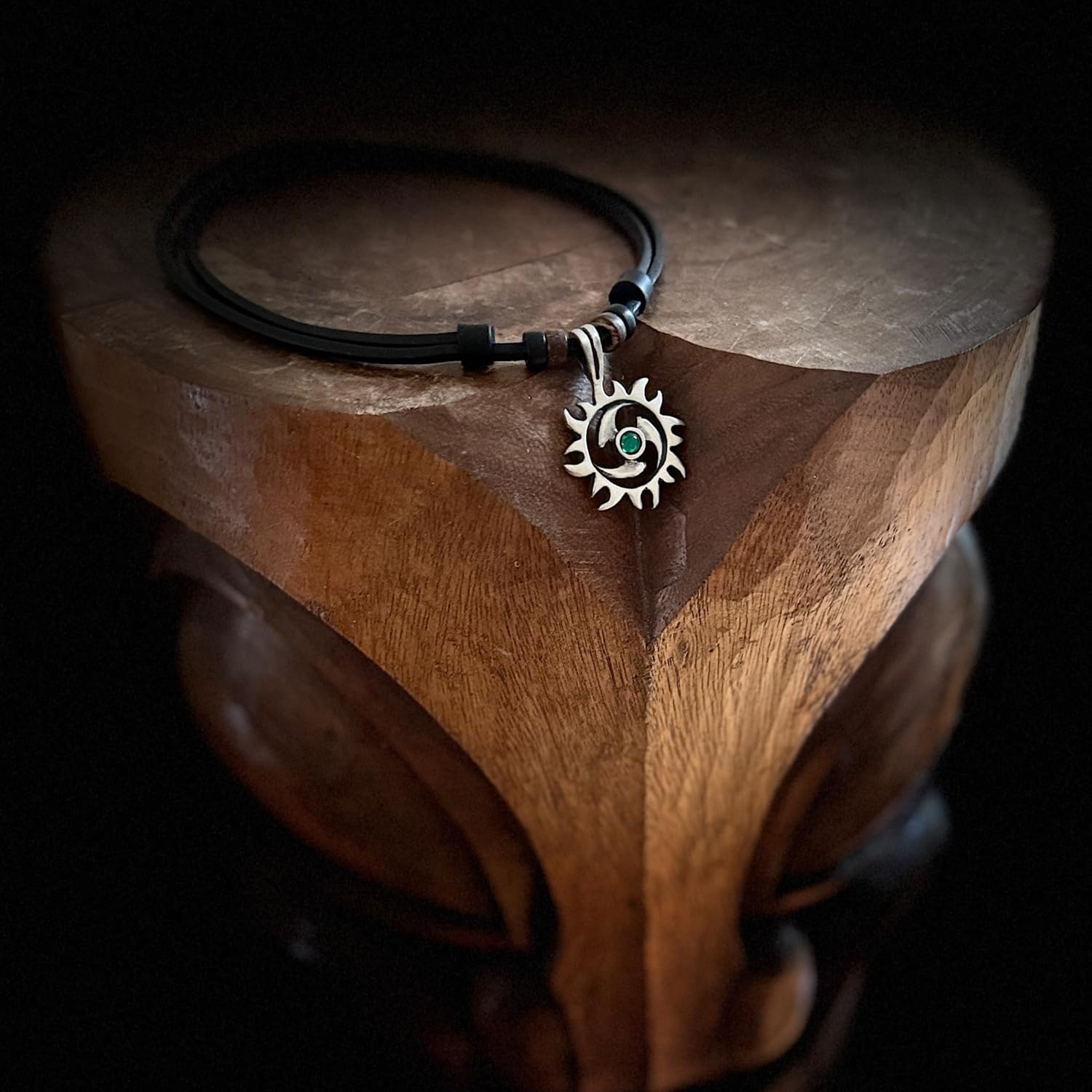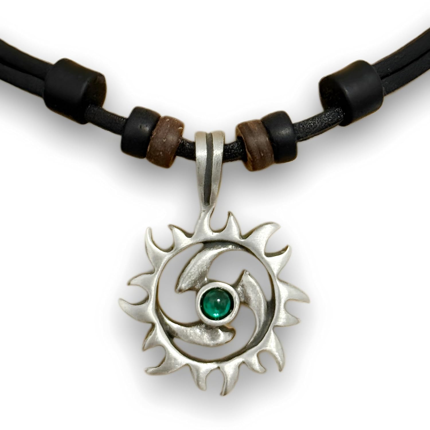 Schwarze Lederkette mit Anhänger in Form einer Sonne (Größe ca. 3 cm), verziert mit Jade-farbenem, grünem Schmuckstein, gefertigt aus feinstem, schadstofffreien Pewter / Einzigartiger Schmuck für Individualisten, der auch perfekt als Geschenk für jeden Anlass geeignet ist