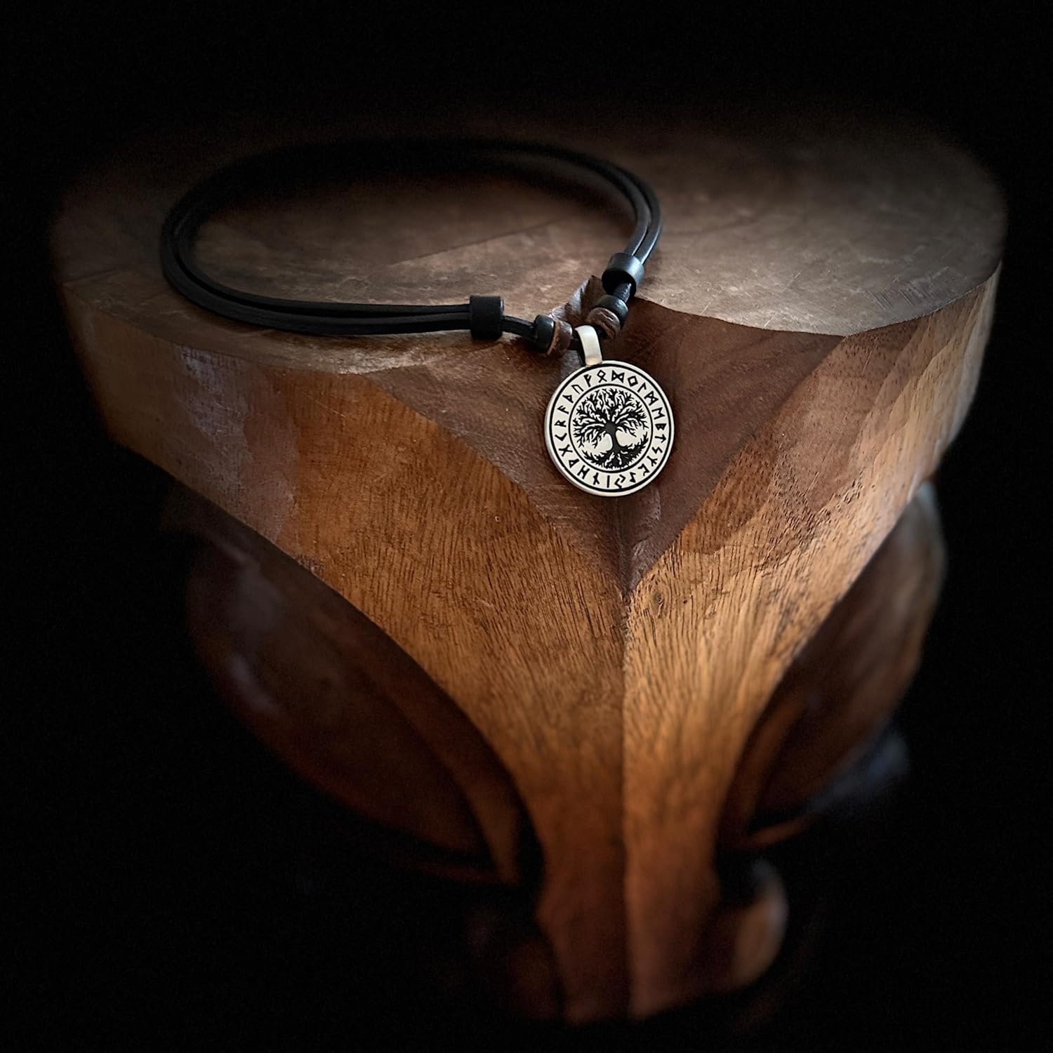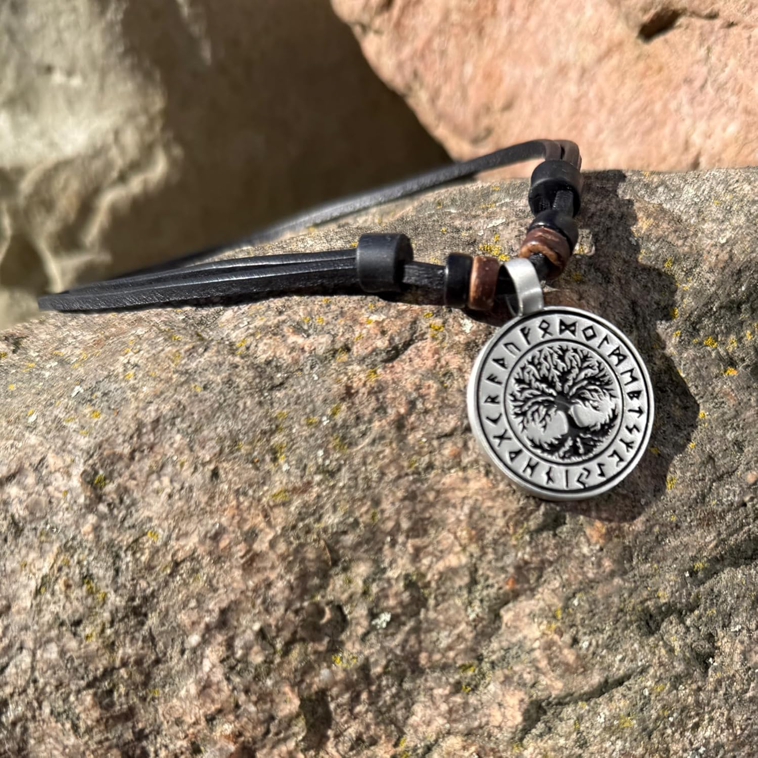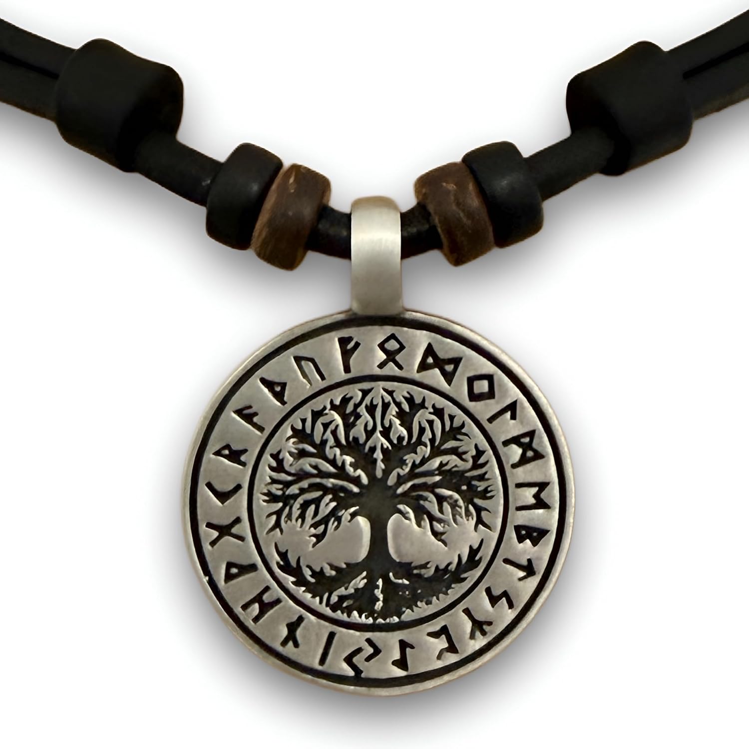 Unsere Weltenbaum / Weltenesche Yggdrasil Halskette kombiniert traditionelles Symbol mit modernem Design. Der runde Anhänger wird von einem strapazierfähigen Lederband gehalten.