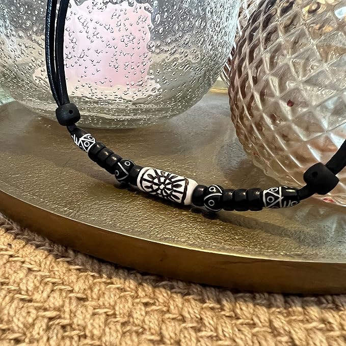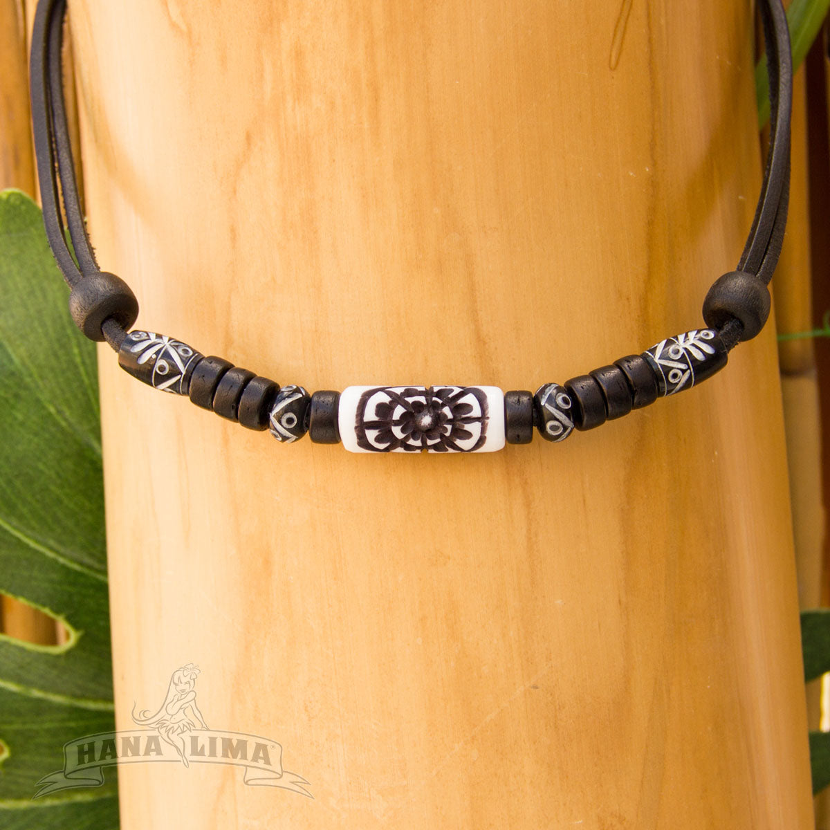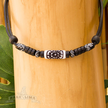 Schwarze Lederkette mit handgeschnitzter Mittelhülse, kombiniert mit gecarvten Tubes, Drums & Kokosnuss / Einzigartiger Schmuck für Individualisten, der, für Frauen und Männer gleichermaßen, auch perfekt als Geschenk für jeden Anlass geeignet ist