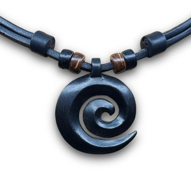 Lederhalskette mit handgeschnitztem Koru Anhänger aus schwarzem Hartholz, dezent kombiniert mit verschiedenen Kokosnussperlen. Der Anhänger hat eine Größe von ca. 3 cm.