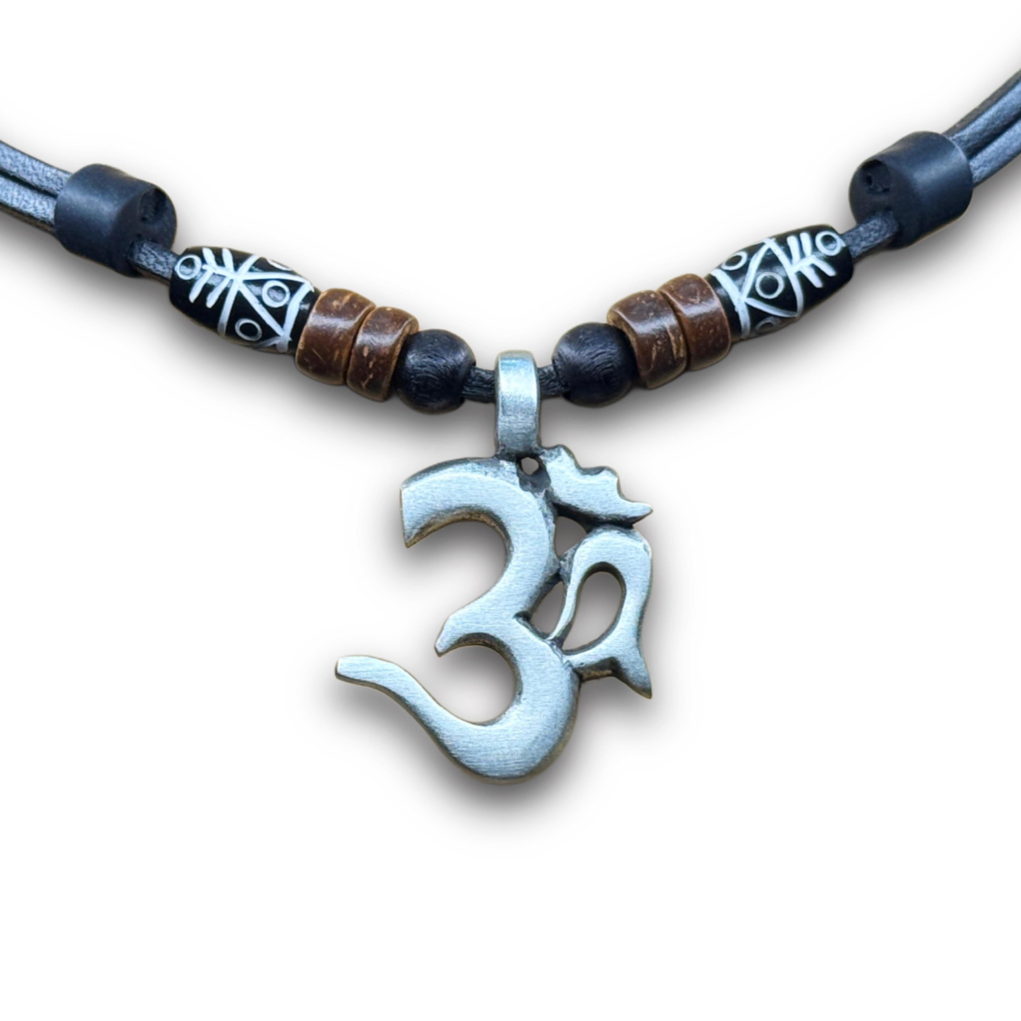 Schwarze Lederhalskette mit Om Zeichen Anhänger aus hochwertigem Pewter, kombiniert mit gecarvten Tubes und Kokosnuss Perlen. Der Anhänger hat eine Größe von ca. 3 cm.