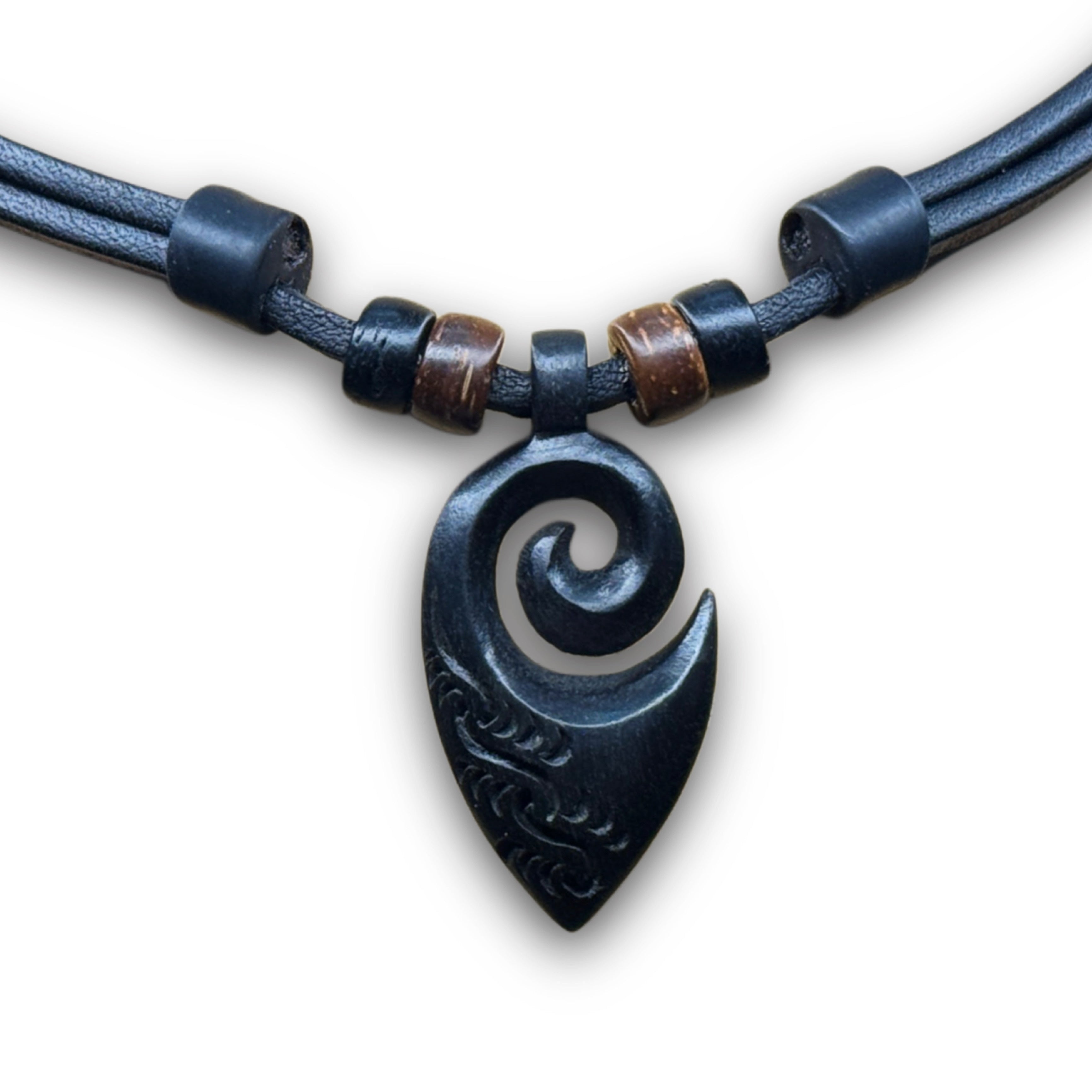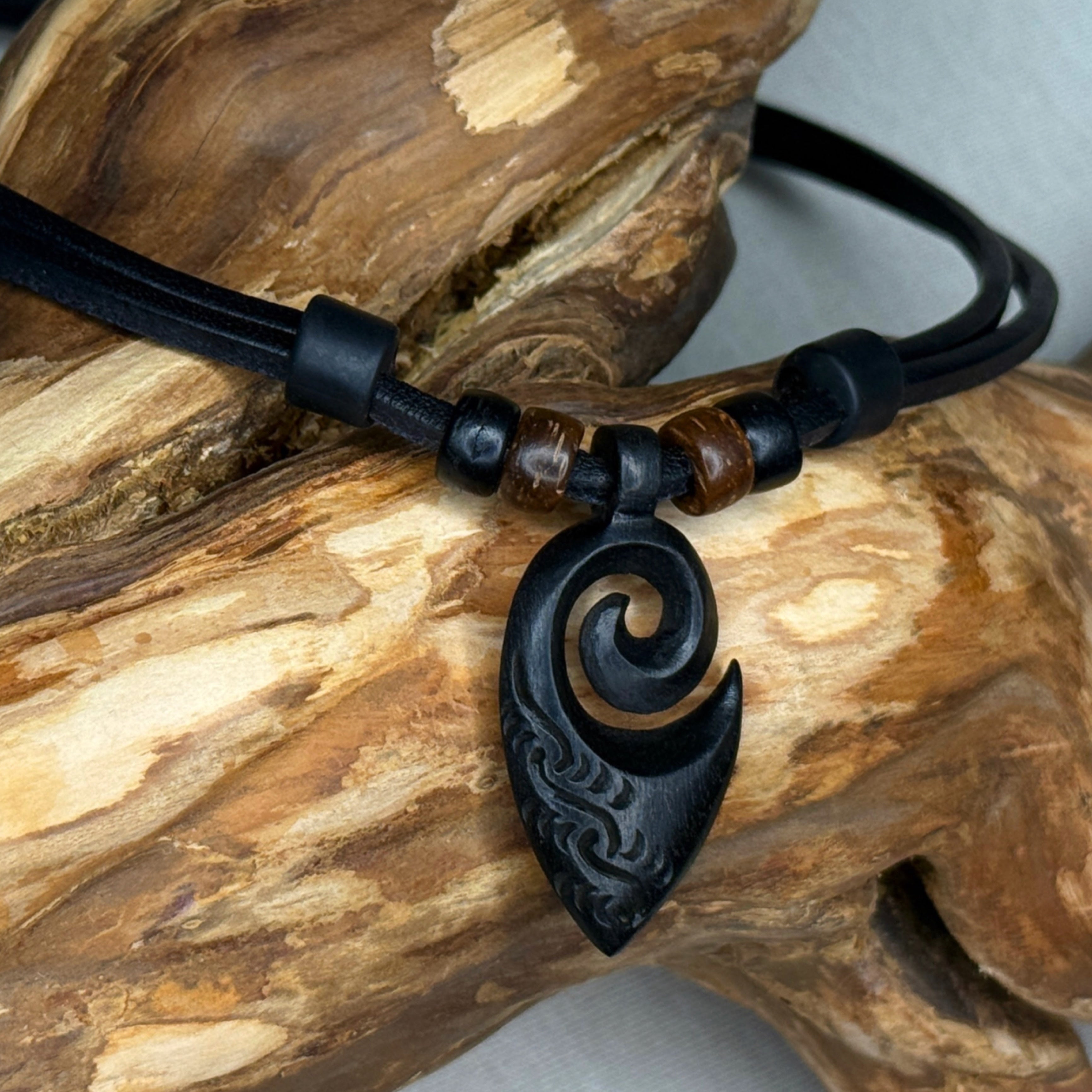 Lederhalskette mit handgeschnitztem Koru Anhänger aus schwarzem Hartholz, kombiniert mit verschiedenfarbigen Kokosnussperlen. Der Anhänger hat eine Größe von ca. 3,5 cm.