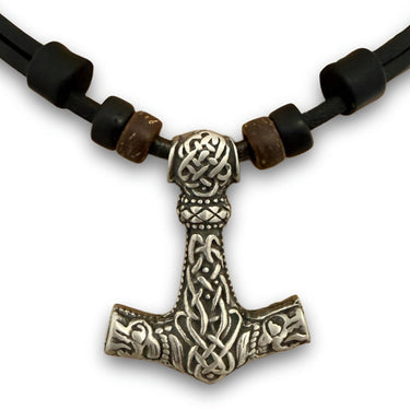 Halskette mit Thorshammer aus blei- und nickelfreiem Pewter, kombiniert mit Kokosnussperlen. Der Anhänger hat eine Größe von ca. 4 cm. Der Mjölnir ist in der germanischen Mythologie die magische Waffe des Gottes Thor, mit dem dieser die Feinde der Götter bekämpft.